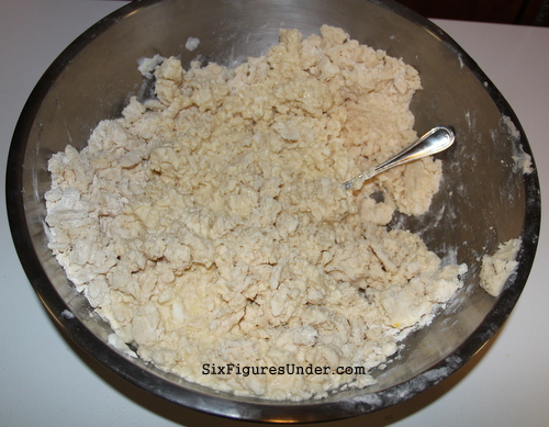 You’ll want to get out the biggest bowl you have (seriously!). Mix the flour, sugar, and salt together. Using a pastry cutter if you have one (if not, a fork will suffice), blend the shortening with the flour mixture.