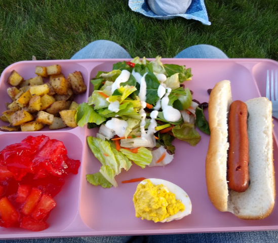 Picnic with G & G— We went to my in-laws to play for the evening. The kids cooked hot dogs over the fire. We had diced seasoned potatoes and green salad that Mike’s mom made and I brought jello with pineapple and deviled eggs. We had pumpkin custard and brownies for dessert. It was all delicous!
