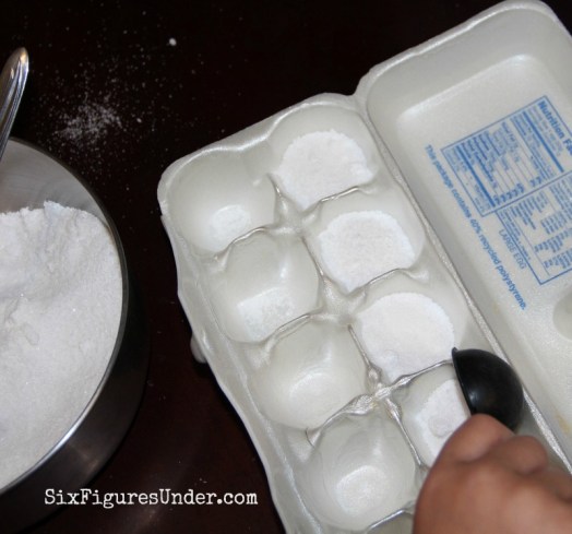 I’ve used a plastic ice cube tray in the past, but it can be hard to get the cubes out . The last time I made a batch, I had a flash of inspiration: use an egg carton! A Styrofoam egg carton made popping the dishwasher detergent tabs out so easy. Just push on the bottom of each one from underneath.